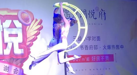 活動還進行了勁爆的空中雙人瑜伽表演,讓業主們從曼妙的歌聲、嗨爆的氣氛中回過神來。相比較之前熱辣的舞蹈,瑜伽舞者迷人的姿態更增添了幾分韻味,業主們紛紛沉醉其中。